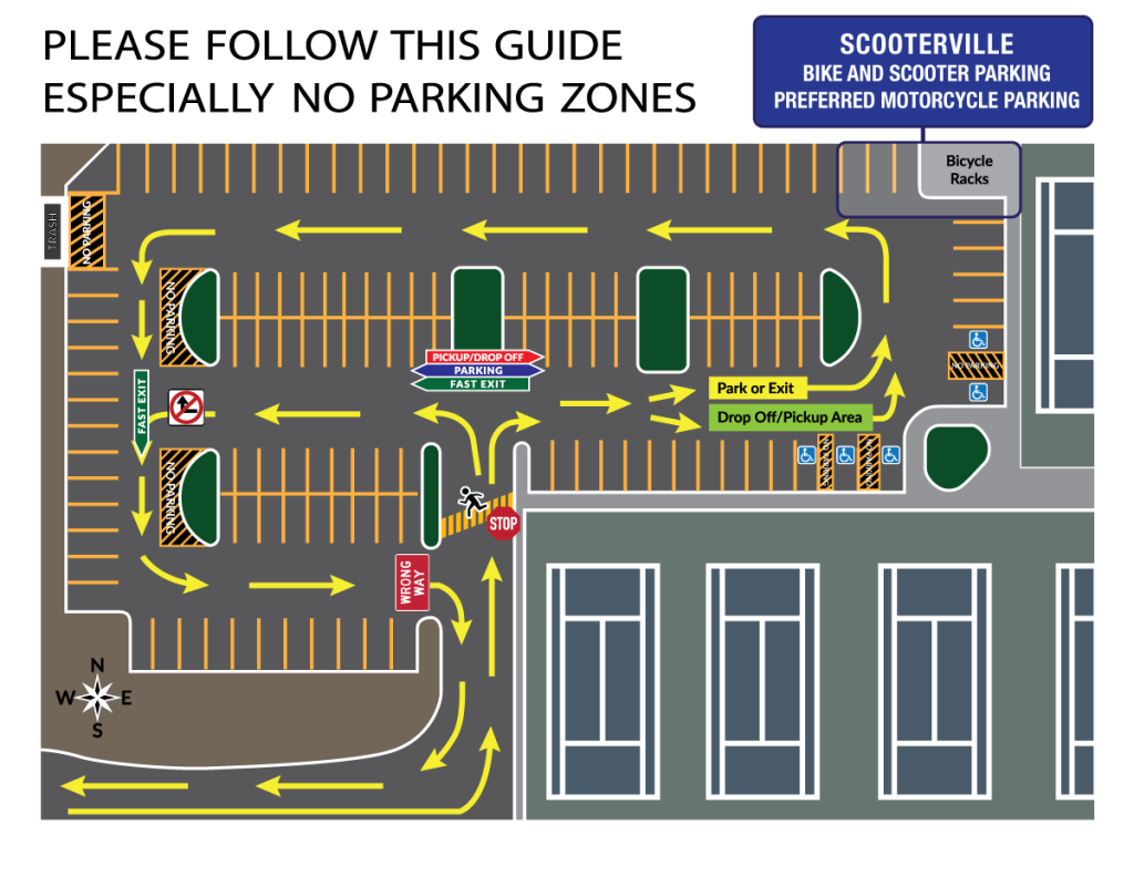 Note the areas of designated no parking and other special areas designated for motorcycle/scooter parking and the flow of traffic. If we all follow these guidelines, traffic will flow much smoother through our lot so there aren’t cars backed/jammed up.